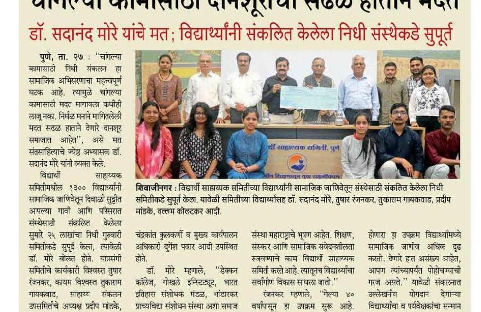 पुणे, ता. २७ : “चांगल्या कामासाठी निधी संकलन हा सामाजिक अभिसरणाचा महत्त्वपूर्ण घटक आहे. त्यामुळे चांगल्या कामासाठी मदत मागायला कधीही लाजू नका. निर्मळ मनाने मागितलेली मदत सदैव हाताने देणारे दानशूर समाजात आहेत”, असे मत संतसाहित्याचे ज्येष्ठ अभ्यासक डॉ. सदानंद मोरे यांनी व्यक्त केले. विद्यार्थी साहाय्यक समितीमधील १३०० विद्यार्थ्यांनी सामाजिक जाणीवेतून संकलित केलेला निधी संस्थेकडे सुपूर्त […]