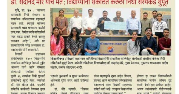 विद्यार्थी साहाय्यक समिती ही पुणे स्थित एक सार्वजनिक सेवाभावी संस्था असून तिचे कार्यक्षेत्र भारतभर आहे. (नोंदणी क्रमांकः ई-२१९. सार्वजनिक विश्वस्त अधिनियम १९५० च्या कलम ५० ए (३) अंतर्गत.)चांगल्या कामासाठी दानशूरांची सदैव हाताने मदत डॉ. सदानंद मोरे यांचे मत ; विद्यार्थ्यांनी संकलित केलेला निधी संस्थेकडे सुपूर्त